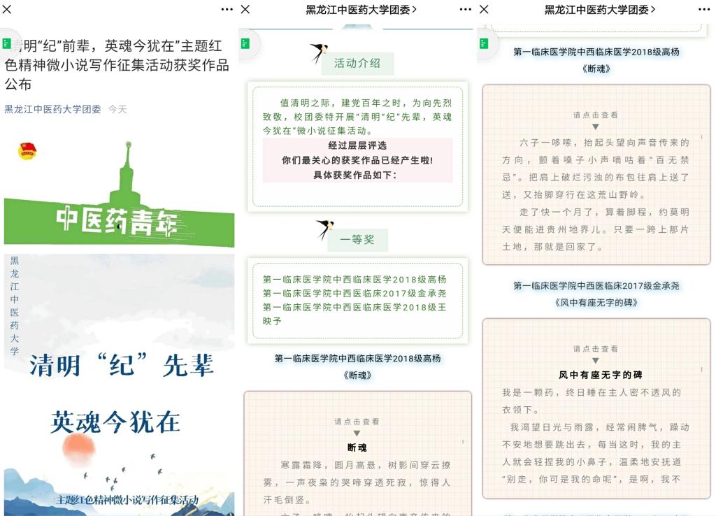 4月3日,校团委组织的“清明‘纪’先辈,英魂今犹在”微小说征文比赛落幕,参赛同学以党史和革命英烈红色事迹为创作蓝本,积极创作“红色”微小说,抒发对党的热爱和革命先辈的崇敬之情。比赛共收到作品60余份,最终评选出一等奖3项、二等奖5项、三等奖7项。优秀作品在校团委微信公众平台进行了展示。