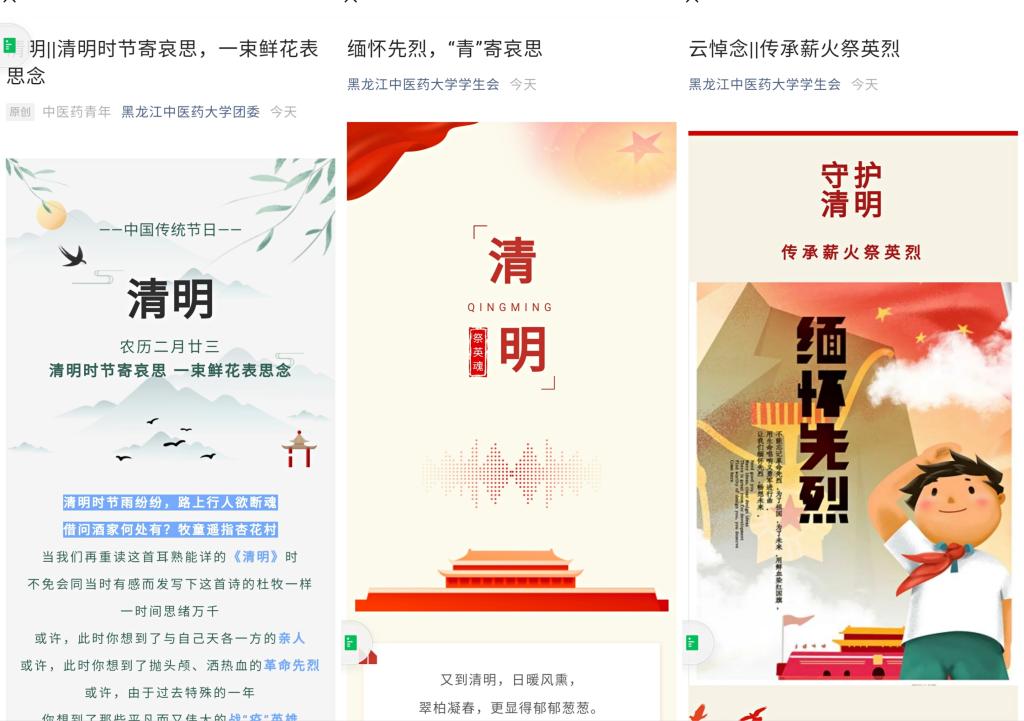 活动期间,校团委、校学生会微信公众平台相继推送“缅怀先烈,‘青’寄哀思”“云悼念,传承薪火祭英烈”“清明时节寄哀思,一束鲜花表思念”“清明节,来自一名普通龙中医学子的清明追思”等推文,倡导广大青年通过“云祭扫”“云献花”等方式,致敬、缅怀革命英烈,厚植爱国情怀,激发奋进动力。
