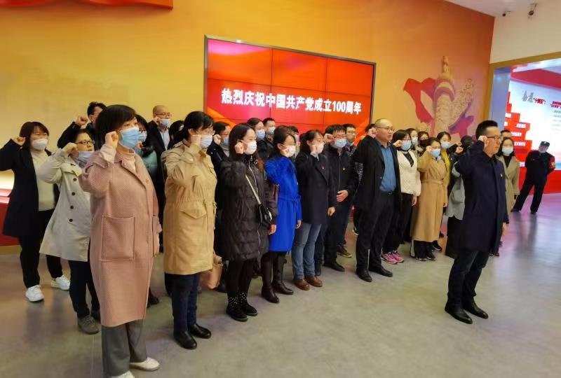 参观结束后,全体党员在宣誓厅,面对党旗,举起右手,重温入党誓词。