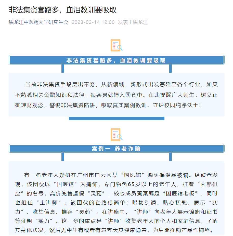 研究生院通过“一对一”电话指导、赴寝室走访宣传、利用“黑龙江中医药大学研究生会”微信公众平台发布警示教育文章等方式,广泛开展防范非法集资宣传教育活动。研究生同学普遍反应,通过宣传教育使大家进一步增强了明辨是非能力和风险防范意识,未来将自觉抵御非法集资,努力营造安全的经济生活氛围。