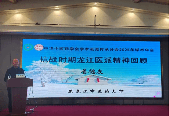 11月1日上午,姜德友教授在中华中医药学会学术流派传承分会2025年学术年会上以“抗战时期龙江医派精神回顾”为题作专题报告,讲述抗战时期龙江医派前辈以医者仁心救死扶伤、以药箱为枪投身抗战的感人事迹,回顾龙江医派的形成发展历程与“闯关东”历史的内在联系,阐释龙江医派精神与东北抗联精神一脉相承的价值内涵。
