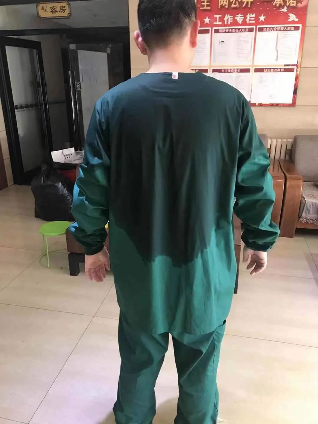 接待、安顿好密接者只是任务的一个开始,接下来的每一天,医疗队都要给隔离人员进行采集核酸、4次隔离区消杀、体温监测等等,看似简单,却耗费着大量的精力和体力,工作6个小时下来,身上就全都湿透了。