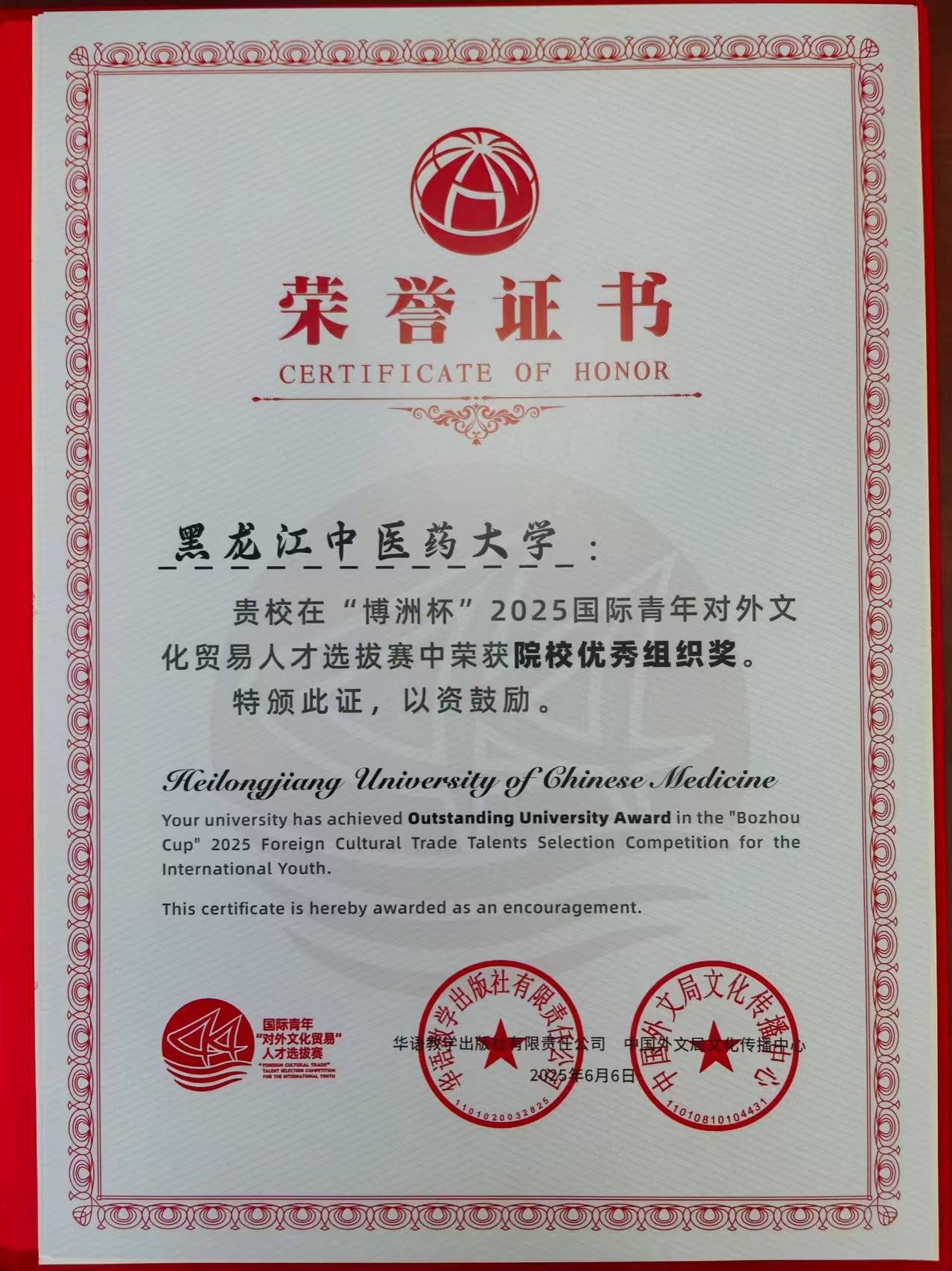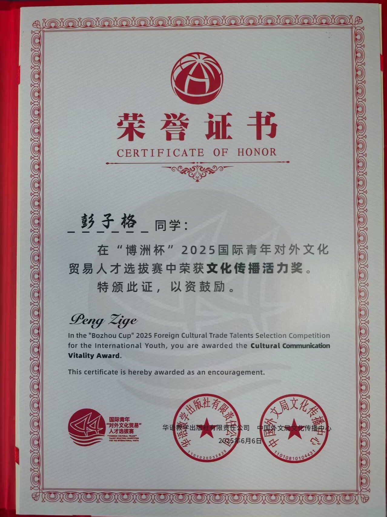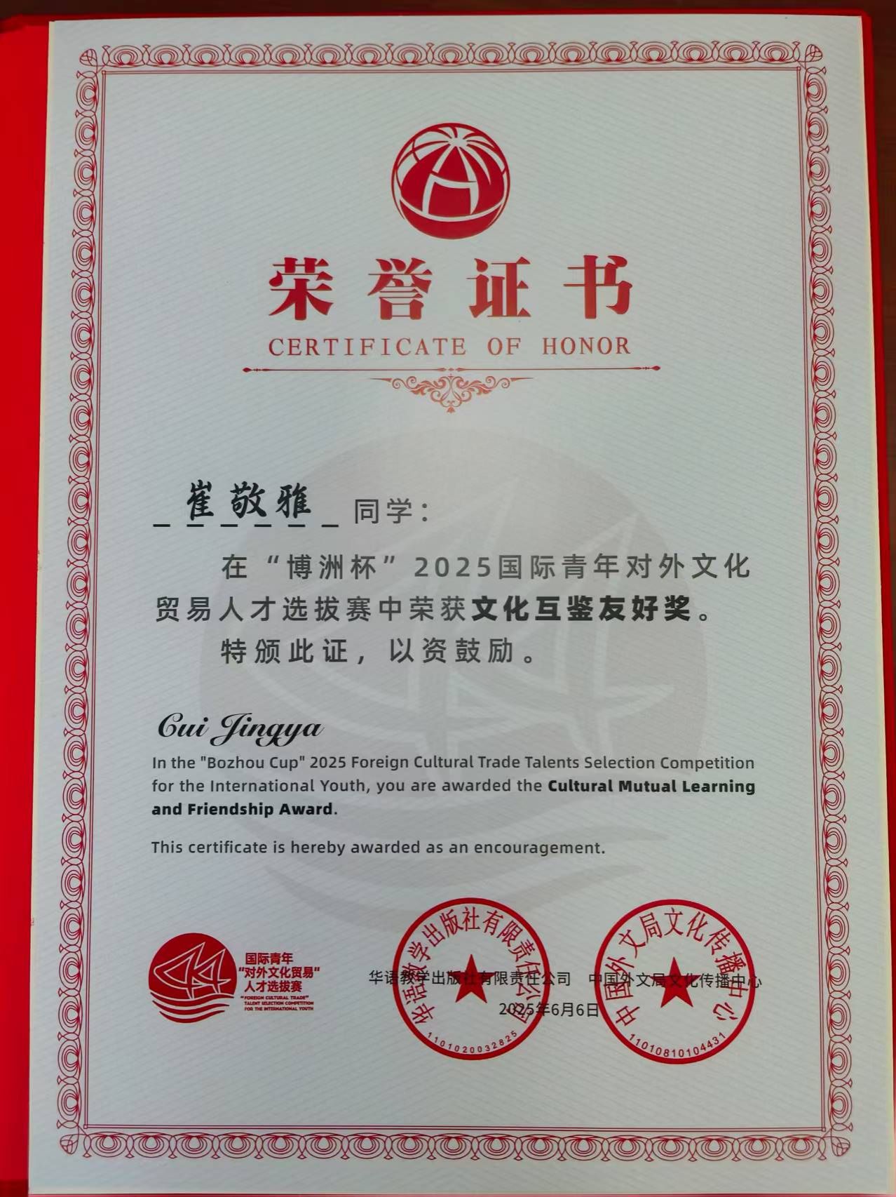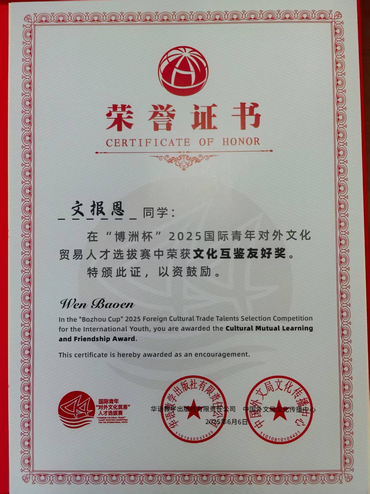 6月6日,由中国外文局文化传播中心和华语教学出版社联合主办的“博洲杯”2025国际青年对外文化贸易人才选拔赛颁奖典礼暨国际青年人才产教融合论坛在杭州举行。华体会平台(中国)选派代表队参赛并获佳绩,副校长张浩参加活动。其中马来西亚籍留学生陈美蓉荣获文化推广贡献奖,韩国籍留学生彭子格荣获文化传播活力奖,朝鲜籍留学生文报恩、崔敬雅荣获文化互鉴友好奖。华体会平台(中国)基础医学院殷越老师、国际教育学院李文英老师和张蕊馨老师荣获优秀指导教师奖,华体会平台(中国)荣获院校优秀组织奖。