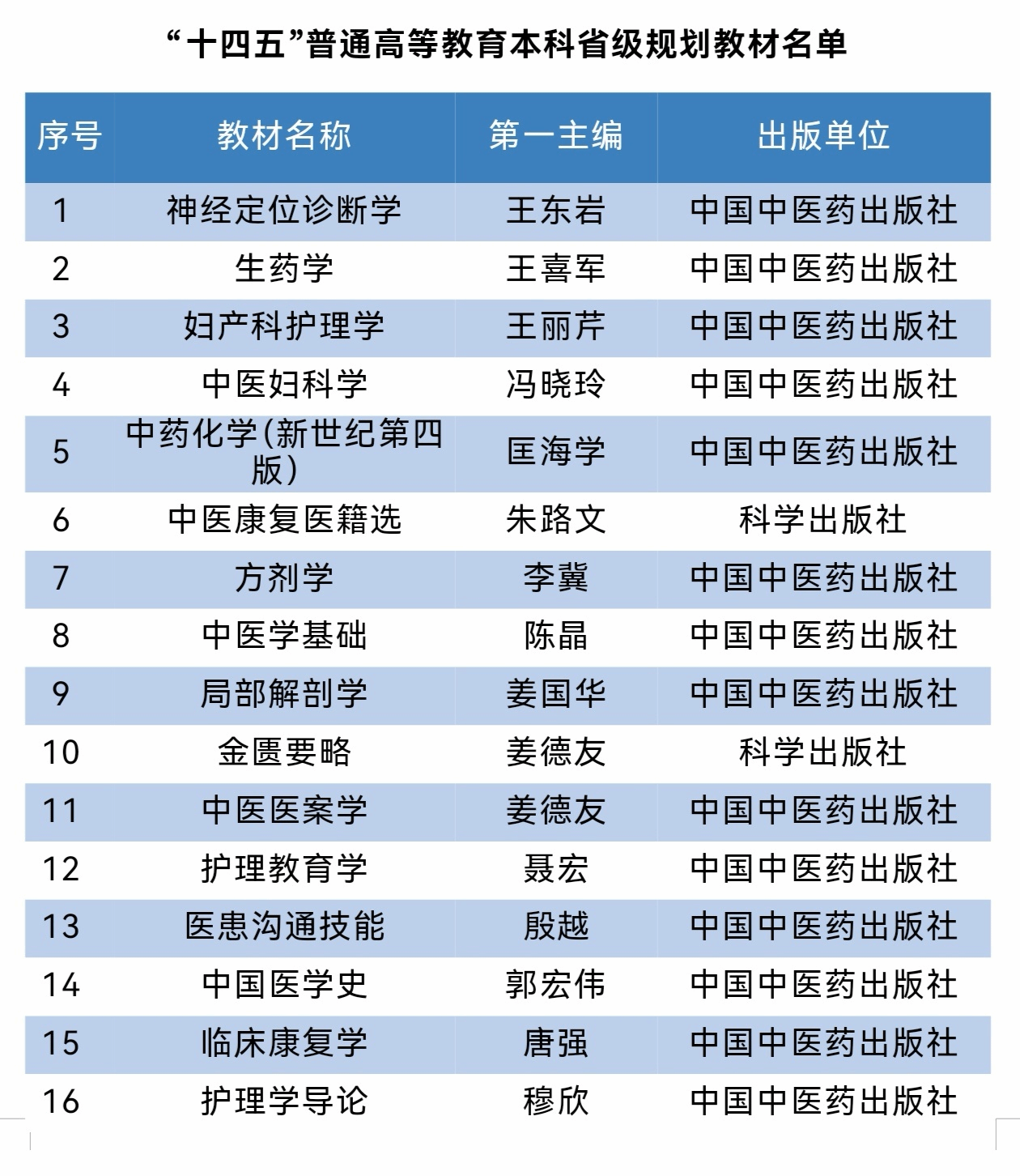 近日,黑龙江省教育厅正式公布《首批黑龙江省“十四五”普通高等教育本科规划教材名单》,全省共认定318种教材。华体会平台(中国)申报的16部本科教材成功入选,内容覆盖中医学、中药学、护理学、康复治疗学等多个核心专业领域,充分彰显华体会平台(中国)在教材建设领域的深厚积淀与突出实力。