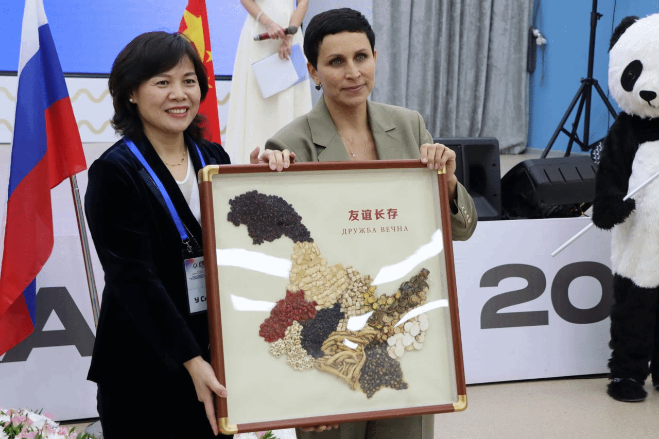 吴修红与阿穆尔国立医学院代理校长伊琳娜分别代表两校互赠象征友谊的礼物