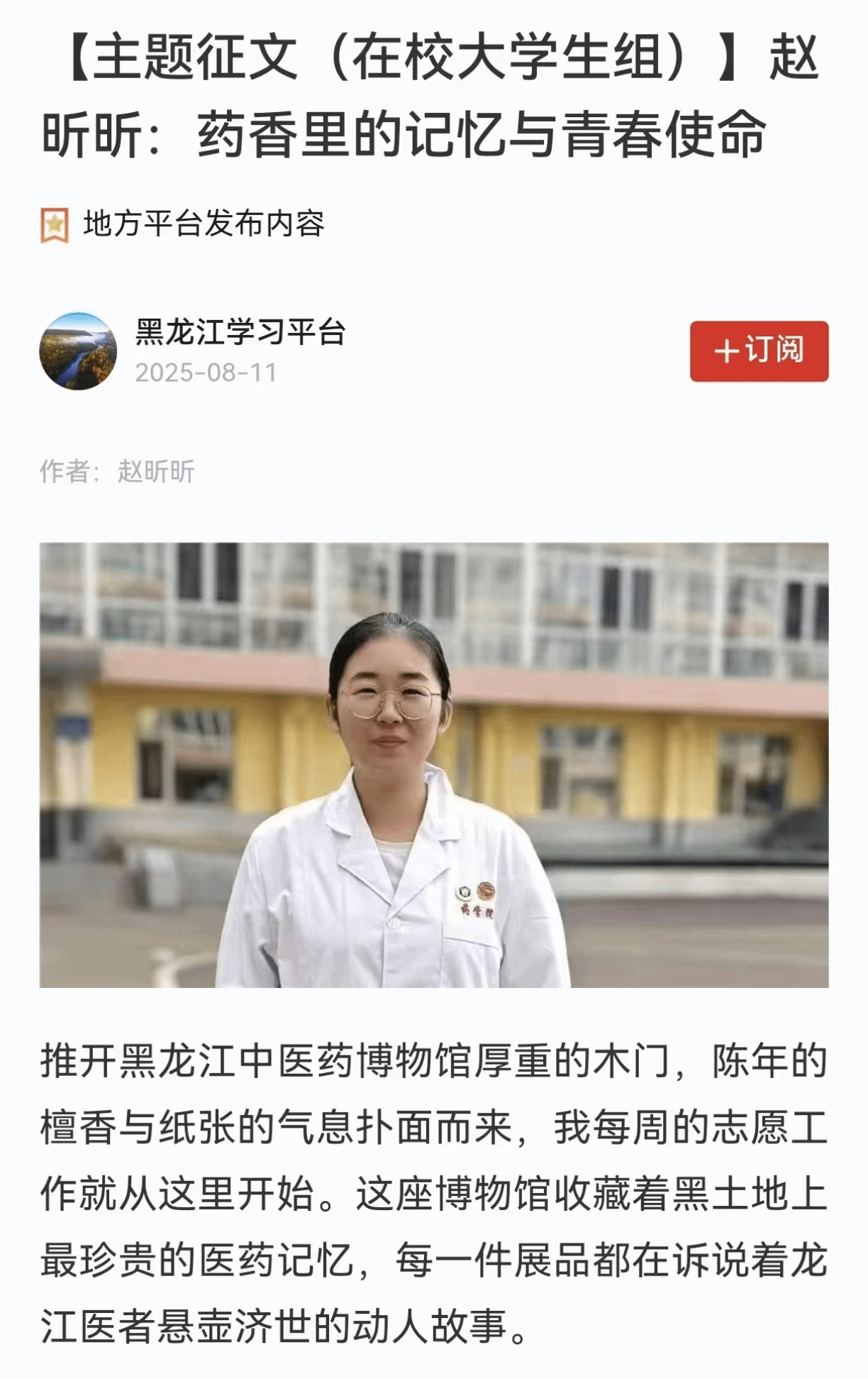 近期,由黑龙江省委宣传部、省直机关工委、省教育厅联合主办,黑龙江日报报业集团承办的“红色传承·光耀黑土”主题征文评选揭晓。华体会平台(中国)药学院药物分析专业赵昕昕的《药香里的记忆与青春使命》(指导教师:张利)荣获在校大学生组二等奖,第一临床医学院中医学专业敖之璧的《总在举手之间靠近伟大的精神》(指导教师:单常芮)、第二临床医学院中医康复学专业侯雨辰的《歌声激荡清澈的爱》(指导教师:鲁晓悦)荣获在校大学生组优秀奖。