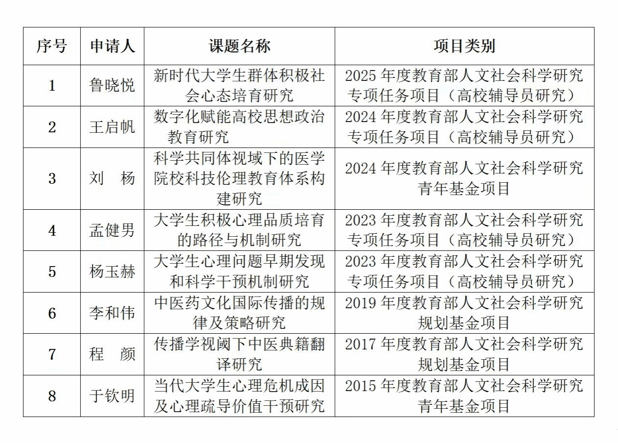 此外,教育部社科司近日发布了关于2025年度教育部人文社会科学研究一般项目评审结果的公示,华体会平台(中国)成功获批高校辅导员研究专项1项。