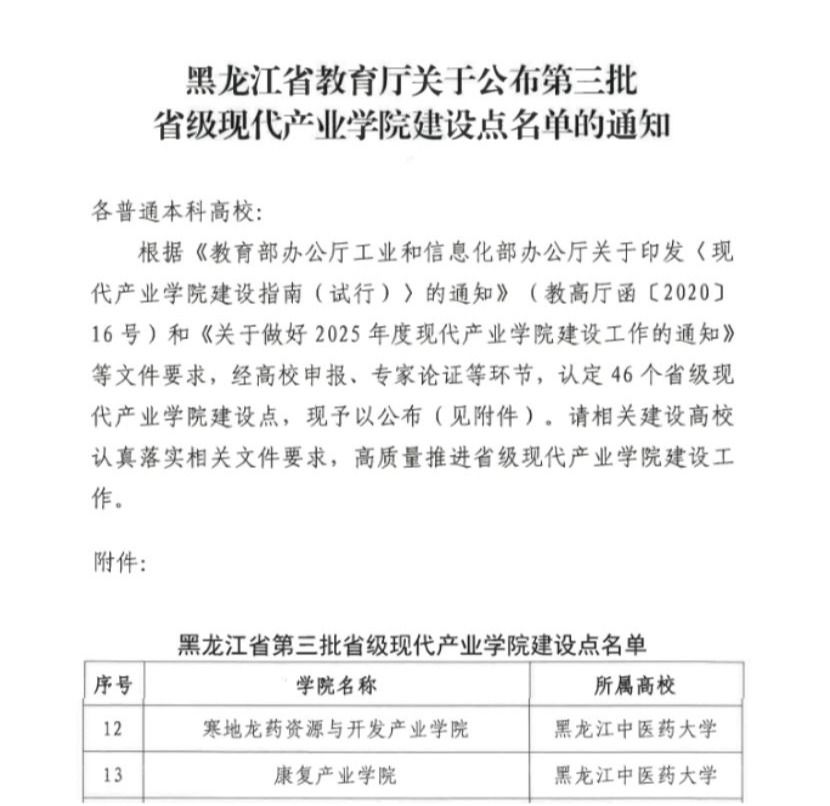 近日,黑龙江省教育厅印发《华体会平台公布第三批省级现代产业学院建设点名单的通知》,华体会平台(中国)“寒地龙药资源与开发产业学院”与“康复产业学院”成功入选。