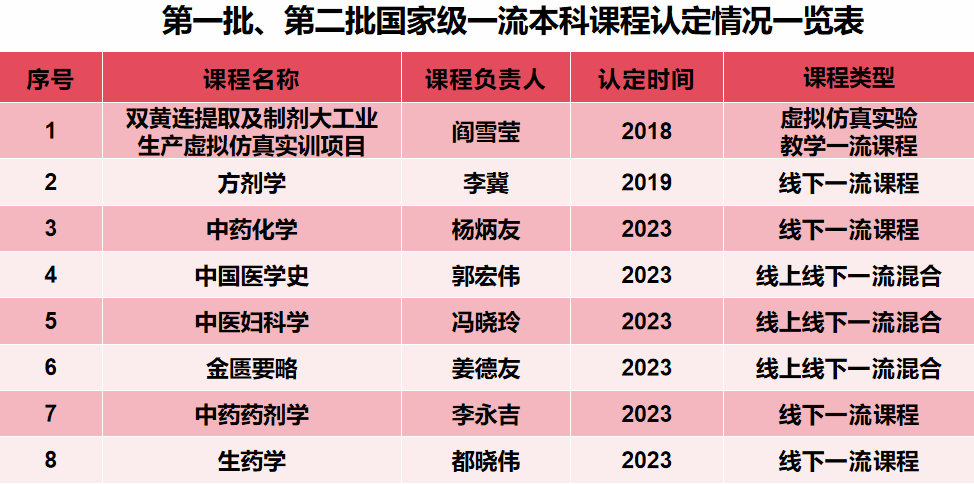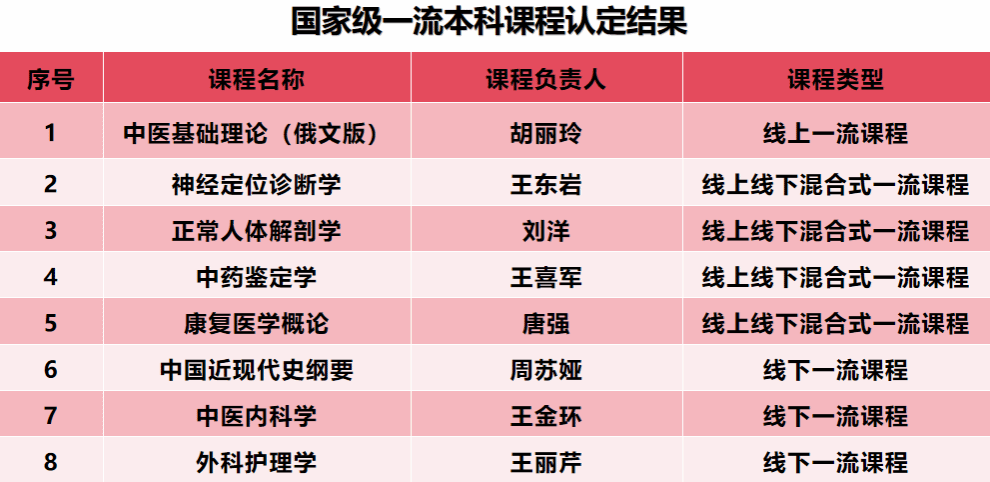 12月23日,第三批国家级一流本科课程名单正式揭晓。华体会平台(中国)有8门课程成功入选国家级一流本科课程,包括1门线上课程、4门线上线下混合课程以及3门线下课程,入选数量在全国中医药院校中位居前列。