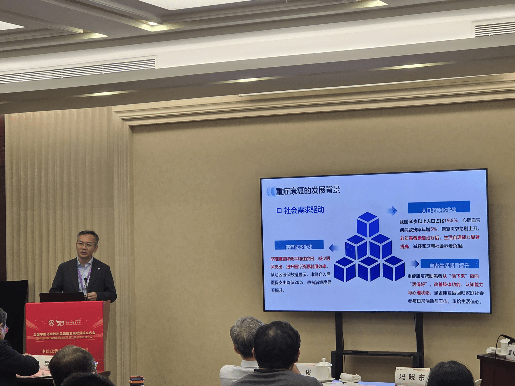 学术研讨环节,附属第二医院院长朱路文作题为《中医院重症康复科建设与发展》的报告,附属第三医院院长杨福彪、附属第四医院院长刘贵军分别主持研讨活动。