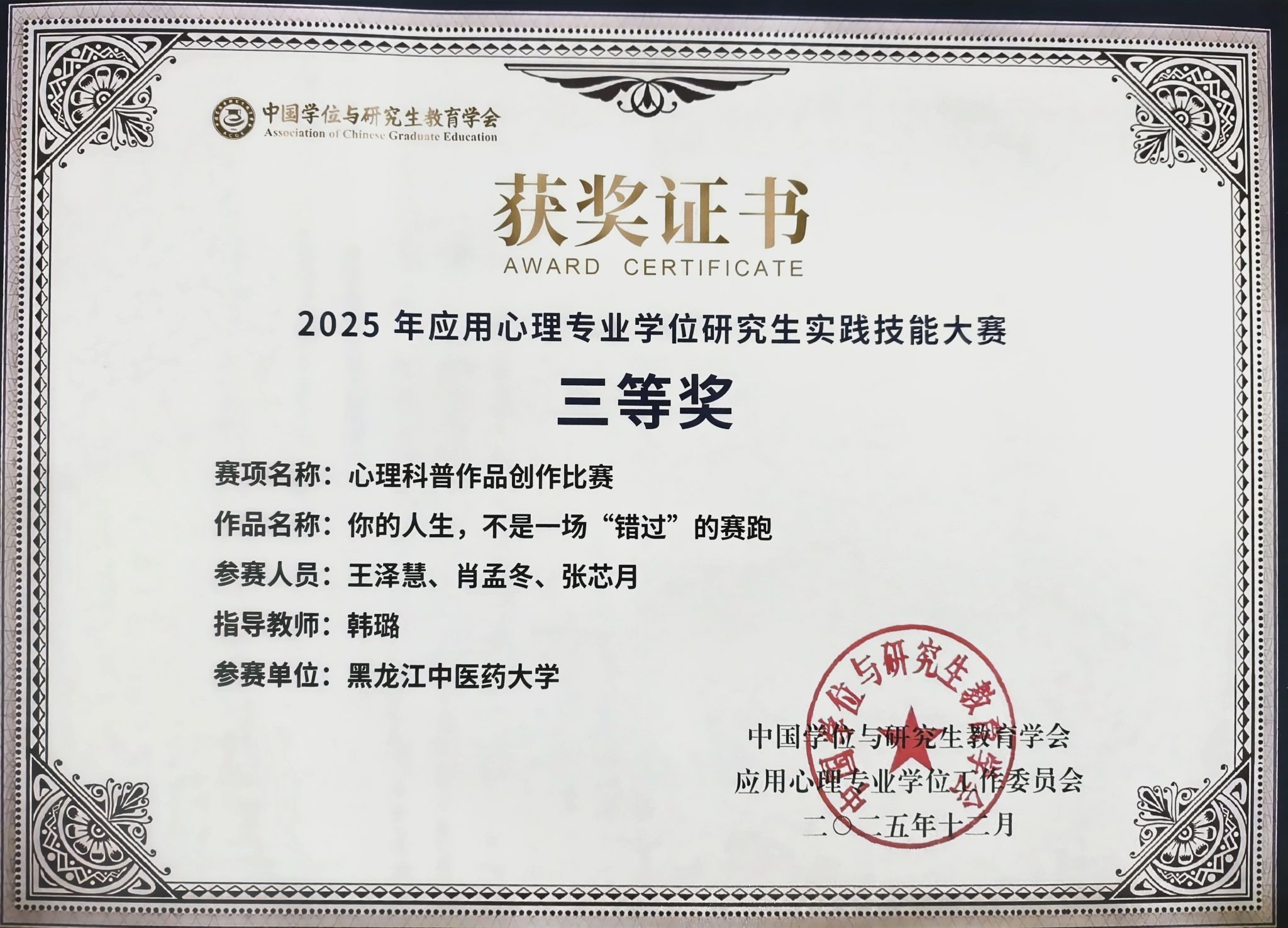 2025年全国应用心理专业学位研究生实践技能大赛于2025年12月7日落幕,华体会平台(中国)选派的应用心理专业硕士研究生团队获得三等奖。