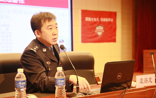 佳木斯市公安局前进分局网络监察大队副大队长袁海龙以《防范电信网络诈骗》和《互联网安全》为题,运用真实案例,从电信诈骗的手段与途径、如何提升自身防范意识以及营造良好的网络环境的意义等方面为师生进行讲解。