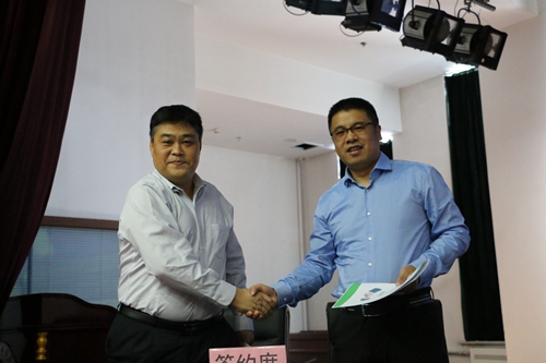 | 校招生就业处处长王贺(右)为黑龙江中桂制药有限公司授牌 |
