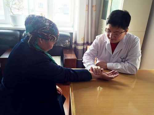 | 周海纯在新疆阿勒泰地区哈萨克医医院为当地群众服务 |