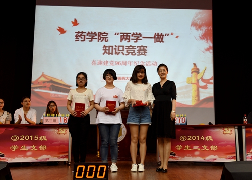 药学院党委举办本次知识竞赛旨在进一步增强党的基层组织建设和党员队伍建设,提升基层党支部的凝聚力、向心力,全面推进“两学一做”学习教育常态化制度化,组织全体师生党员用实际行动为党的第96个生日献礼。经过各支部选拔推荐,来自学院6个基层党支部的18名党员代表参加比赛,经过必答题、抢答题、闯关题和风险题四个环节的激烈角逐,最终,2014级学生二支部代表队凭借扎实的理论功底、精准的回答赢得冠军;教工三支部代表队和2014级学生一支部代表队获得二等奖;教工一支部代表队、教工二支部代表队、2015级学生支部代表队获得三等奖。