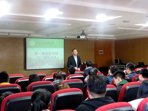 4月24日下午,第一临床医学院在大学生活动中心第二活动室举办2017届毕业生就业指导讲座。学院党委副书记、副院长丰光结合具体事例分析往年就业形势,向同学们介绍了往届毕业生的就业方向和地域分布等情况,提醒毕业生们在面试时应注意个人言行和着装,打造积极开朗的个人形象,并希望同学们结合自身实际,考虑社会发展的需要,有针对性地选择未来职业,切勿盲目偏激。在互动交流环节,他还耐心地解答同学们提出的问题。