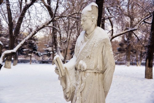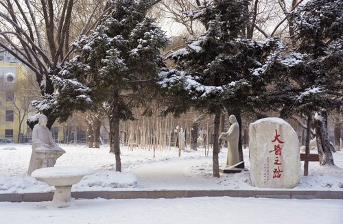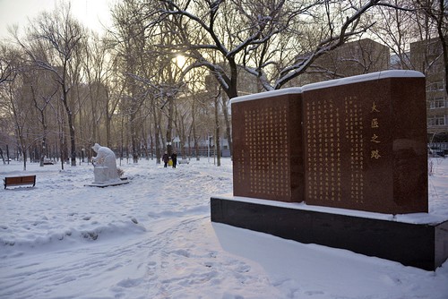 纷飞的雪花给冬季校园增添了几分童话色彩:典雅的主楼在白雪的映衬下显得更加端庄肃穆;名医雕塑在雪中的大医之路上“冷静”沉思;体育场也覆盖上一层厚厚的、洁白的“棉被”……校园中处处充满诗情画意。