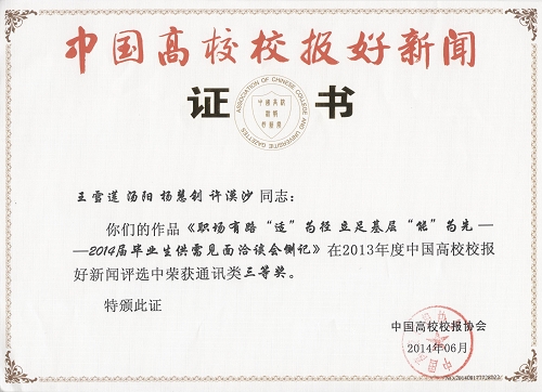 2013年度中国高校校报好新闻评选结果日前揭晓,华体会平台(中国)校报编辑部选送的三篇作品获奖。其中,常滨毓、白雪飞撰写的《以武会友留学生热爱太极拳》获消息类二等奖,石全福撰写的《打造中俄学术文化交流的典范——记中俄生物医药论坛举办十周年》和学生记者王雪莲、汤阳、杨慧钊、许漠沙撰写的《职场有路“适”为径立足基层“能”为先——2014届毕业生供需见面洽谈会侧记》获通讯类三等奖。